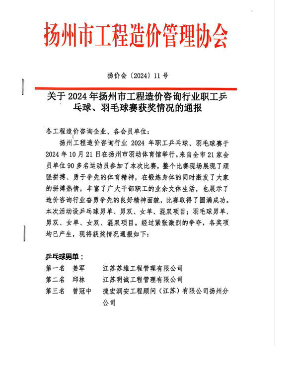 此次我司選手參賽并取得第一名的好成績,展現出蘇維員工良好的精神風貌和奮勇争先的體育精神,爲蘇維公司以及揚州市造價咨詢行業争得了榮譽。